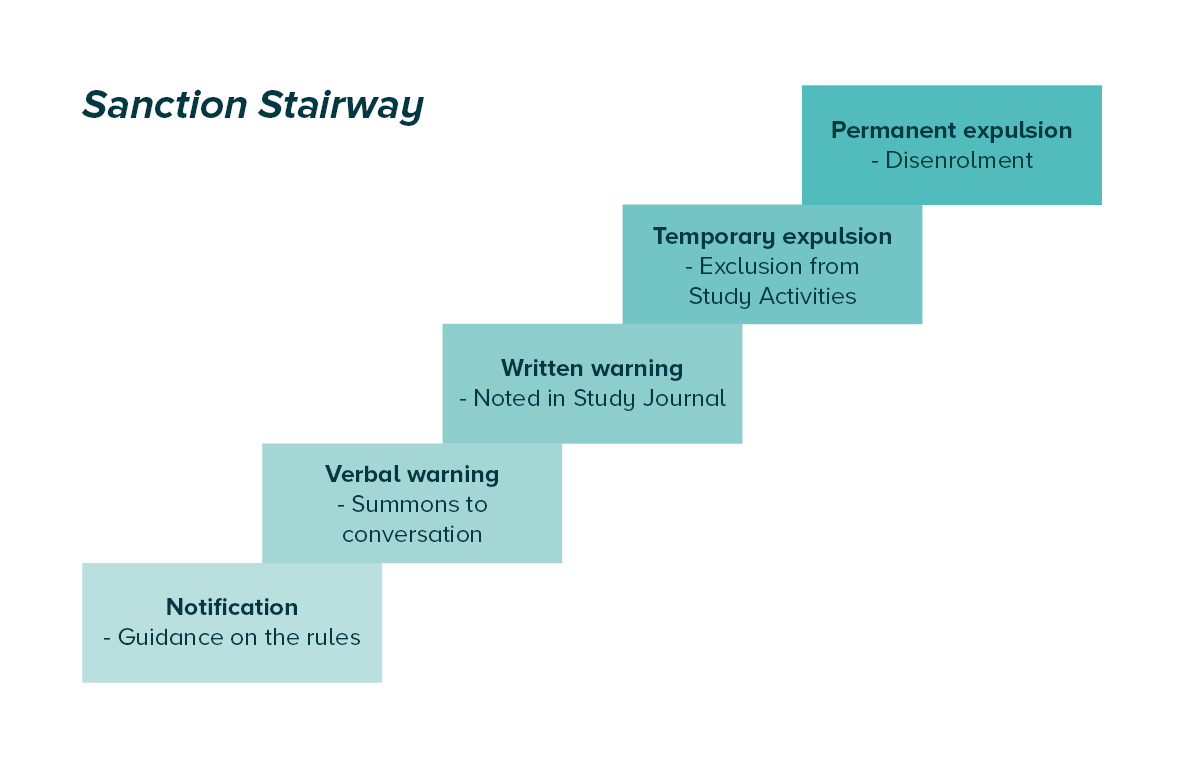 Below you will find an overview of UCL's sanction possibilites. The full version, including explanations, can be found in the 'Standards for contact and behaviour'.